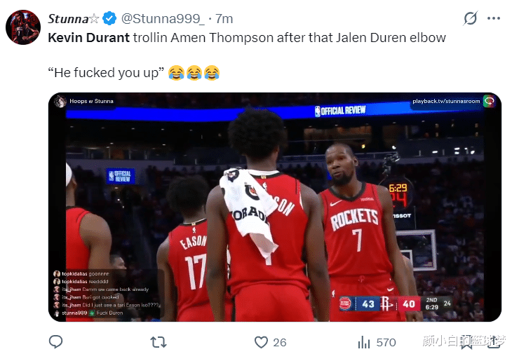 这场比赛最有趣的一幕,在杜伦肘击阿门后,杜兰特朝着阿门喷了一句垃圾话:他把你给毁掉了!哈哈哈哈,随后裁判吹罚了杜伦二级恶意犯规直接驱逐出场,KD真是狠起来自己人都喷。