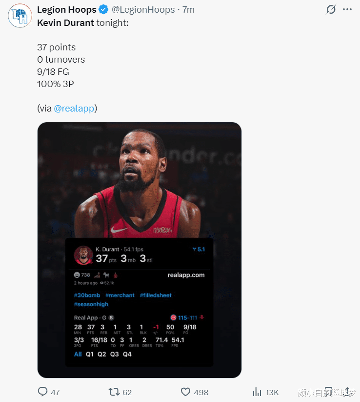 全场比赛,杜兰特28分钟,18中9,三分3中3,罚球18中16,拿到37分3篮板1助攻3抢断1盖帽0失误,命中率50%中金优配,三分命中率100%,真实命中率71.4%,正负值-1,这样的表现都输球了。